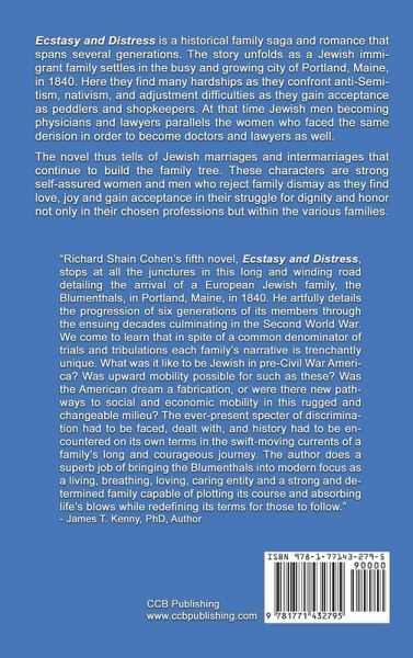 Ecstasy and Distress is a historical family saga and romance that spans several generations. The story unfolds as a Jewish immigrant family settles in the busy and growing city of Portland, Maine, in 1840. Here they find many hardships as they confront anti-Semitism, nativism, and adjustment difficulties as they gain acceptance as peddlers and shopkeepers. At that time Jewish men becoming physicians and lawyers parallels the women who faced the same derision in order to become doctors and lawyers as well. The novel thus tells of Jewish marriages and intermarriages that continue to build the family tree. These characters are strong self-assured women and men who reject family dismay as they find love, joy and gain acceptance in their struggle for dignity and honor not only in their chosen professions but within the various families. Praise received: "Richard Shain Cohen's fifth novel, Ecstasy and Distress, stops at all the junctures in this long and winding road detailing the arrival of a European Jewish family, the Blumenthals, in Portland, Maine, in 1840. He artfully details the progression of six generations of its members through the ensuing decades culminating in the Second World War. We come to learn that in spite of a common denominator of trials and tribulations each family's narrative is trenchantly unique. What was it like to be Jewish in pre-Civil War America? Was upward mobility possible for such as these? Was the American dream a fabrication, or were there new pathways to social and economic mobility in this rugged and changeable milieu? The ever-present specter of discrimination had to be faced, dealt with, and history had to be encountered on its own terms in the swift-moving currents of a family's long and courageous journey. The author does a superb job of bringing the Blumenthals into modern focus as a living, breathing, loving, caring entity and a strong and determined family capable of plotting its course and absorbing life's blows while redefining its terms for those to follow." - James T. Kenny, PhD, Author About the Author: Richard Shain Cohen of Cape Elizabeth, Maine, is originally from Boston. He retired from the University of Maine at Presque Isle after serving as Vice President of Academic Affairs and Professor of English. He holds B.S., M.A., and Ph.D. degrees. Richard served in the military and is a U.S. Army veteran. His own publications include: Fiction-Ecstasy and Distress; Our Seas of and Love; Monday: End of the Week; Be Still, My Soul; and Petal on a Black Bough. Non-fiction-Healing After Dark: Pioneering Compassionate Medicine at the Boston Evening Clinic; The Forgotten Longfellow: Man in the Shadows; Poetry-Only God Can Make a Tree. He also wrote chapters for Aroostook: Land of Promise; academic reviews and articles, and - with the aid of a Shell Grant - a monograph on Samuel Richardson that can be found in major library holdings. He served as editor of the journal Husson Review and was principal participant in a National Endowment for the Arts Grant for "Images of Aroostook" that was exhibited throughout the State of Maine.