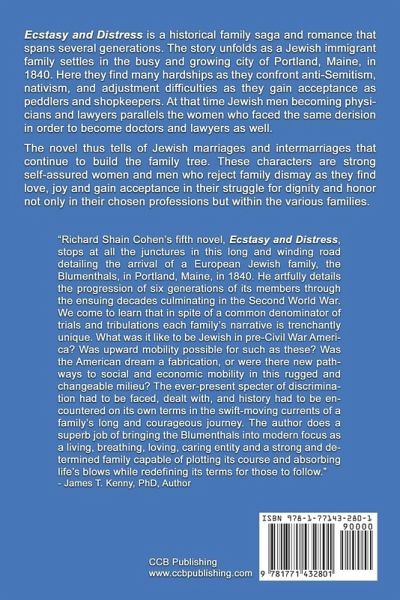 Ecstasy and Distress is a historical family saga and romance that spans several generations. The story unfolds as a Jewish immigrant family settles in the busy and growing city of Portland, Maine, in 1840. Here they find many hardships as they confront anti-Semitism, nativism, and adjustment difficulties as they gain acceptance as peddlers and shopkeepers. At that time Jewish men becoming physicians and lawyers parallels the women who faced the same derision in order to become doctors and lawyers as well. The novel thus tells of Jewish marriages and intermarriages that continue to build the family tree. These characters are strong self-assured women and men who reject family dismay as they find love, joy and gain acceptance in their struggle for dignity and honor not only in their chosen professions but within the various families. Praise received: "Richard Shain Cohen's fifth novel, Ecstasy and Distress, stops at all the junctures in this long and winding road detailing the arrival of a European Jewish family, the Blumenthals, in Portland, Maine, in 1840. He artfully details the progression of six generations of its members through the ensuing decades culminating in the Second World War. We come to learn that in spite of a common denominator of trials and tribulations each family's narrative is trenchantly unique. What was it like to be Jewish in pre-Civil War America? Was upward mobility possible for such as these? Was the American dream a fabrication, or were there new pathways to social and economic mobility in this rugged and changeable milieu? The ever-present specter of discrimination had to be faced, dealt with, and history had to be encountered on its own terms in the swift-moving currents of a family's long and courageous journey. The author does a superb job of bringing the Blumenthals into modern focus as a living, breathing, loving, caring entity and a strong and determined family capable of plotting its course and absorbing life's blows while redefining its terms for those to follow." - James T. Kenny, PhD, Author About the Author: Richard Shain Cohen of Cape Elizabeth, Maine, is originally from Boston. He retired from the University of Maine at Presque Isle after serving as Vice President of Academic Affairs and Professor of English. He holds B.S., M.A., and Ph.D. degrees. Richard served in the military and is a U.S. Army veteran. His own publications include: Fiction-Ecstasy and Distress; Our Seas of and Love; Monday: End of the Week; Be Still, My Soul; and Petal on a Black Bough. Non-fiction-Healing After Dark: Pioneering Compassionate Medicine at the Boston Evening Clinic; The Forgotten Longfellow: Man in the Shadows; Poetry-Only God Can Make a Tree. He also wrote chapters for Aroostook: Land of Promise; academic reviews and articles, and - with the aid of a Shell Grant - a monograph on Samuel Richardson that can be found in major library holdings. He served as editor of the journal Husson Review and was principal participant in a National Endowment for the Arts Grant for "Images of Aroostook" that was exhibited throughout the State of Maine.