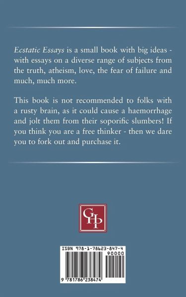 Ecstatic Essays is a small book with big ideas - with essays on a diverse range of subjects from the truth, atheism, love, the fear of failure and much, much more. This book is not recommended to folks with a rusty brain, as it could cause a haemorrhage and jolt them from their soporific slumbers! If you think you are a free thinker - then we dare you to fork out and purchase it.