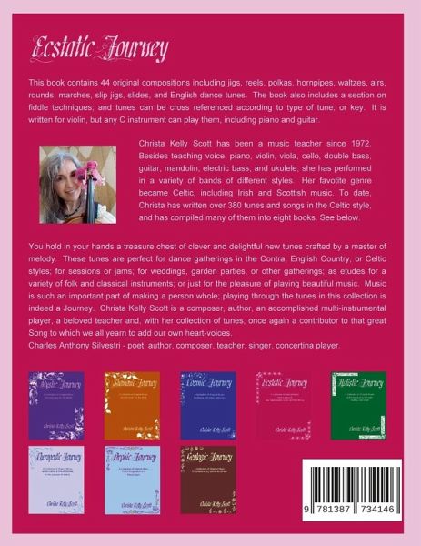 Ecstatic Journey contains 44 original compositions including jigs, reels, polkas, hornpipes, waltzes, airs, rounds, marches, slip jigs, slides, and dance tunes, in the Celtic style for violin (fiddle) or any other C instrument such as flute, penny whistle, concertina, accordion, mandolin, banjo, guitar, or piano. Chord notation is included for accompaniment. It also contains personal inspirations and stories based on the Law of Attraction, gratitude, appreciation, and love, as well as a few pictures; all surrounded by graphics that could be colored if so desired. The Appendix includes instruction on how to play the Irish fiddle style as well as a breakdown of the tunes in their categories and keys. This is not your ordinary music book. It's a magical experience (journey) for the beginning musician as well as the seasoned professional. Ecstatic Journey is book #4 of eight books in the series "The Bardic Journeys of Kelawen".