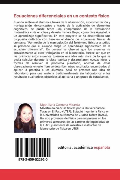 Cuando se lleva al alumno a través de la observación, experimentación y manipulación de conceptos a través de la activación de elementos cognitivos, se puede tener una comprensión de la abstracción matemática vista en clase y de esta manera llegar, como dice Ausubel, a un aprendizaje significativo. En este proyecto se ha desarrollado una propuesta didáctica con base en el diseño de situaciones físicas de contexto: Por medio de la manipulación del fenómeno físico a estudiar, se pretende que el alumno tenga un aprendizaje significativo de la ecuación diferencial . En general se observó que los alumnos se entusiasmaron al estar trabajando en el laboratorio. Parece ser que en las prácticas estos alumnos tuvieron una idea más clara de lo que se pedía calcular durante la clase teórica y desarrollaron nuevas ideas y formas de resolver el problema planteado, además de estas observaciones en este libro se describen otros resultados encontrados al aplicar la práctica a los alumnos. Aquí sepresenta una idea de laboratorio para una materia tradicionalmente sin laboratorios y los resultados cualitativos obtenidos al aplicarla a un grupo de estudiantes.