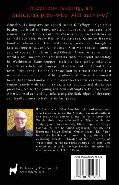 Ecuador, the long-awaited sequel to the O Trilogy - high stake battles, political intrigue, mystery, kidnapping, suspense, and romance as old friends and new, chase a lethal virus hatched in an insidious plot. From Rio to the Amazon, Quito to Bogotá, familiar characters, like old shoes, walk us through a kaleidoscope of adventure: Nusmen, Old Man Shuskin, Sheilla and, of course, Jim, Brush, and Glenda. A team of some of the world's best hackers and researchers from the secret laboratory in Washington State support multiple hair-raising missions. Colombian rebels with unexpected charm link up to aid Jim's team. Throughout, Colonel Johnson battles himself and his past while attempting to blend his professional life with a normal homelife for his family. In Jim's absence, Heather oversees their remote ranch with starlit skies, glass apples, and dangerous predators, while their young son Pedro attempts to fit into a white America. A shock ending lurks along the dark edges of the story and finally comes to light in its last pages.