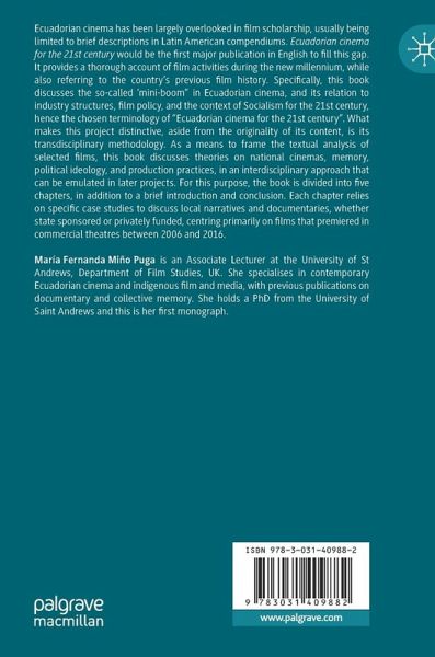 Ecuadorian cinema has been largely overlooked in film scholarship, usually being limited to brief descriptions in Latin American compendiums. Ecuadorian cinema for the 21st century would be the first major publication in English to fill this gap. It provides a thorough account of film activities during the new millennium, while also referring to the country's previous film history. Specifically, this book discusses the so-called 'mini-boom" in Ecuadorian cinema, and its relation to industry structures, film policy, and the context of Socialism for the 21st century, hence the chosen terminology of "Ecuadorian cinema for the 21st century". What makes this project distinctive, aside from the originality of its content, is its transdisciplinary methodology. As a means to frame the textual analysis of selected films, this book discusses theories on national cinemas, memory, politicalideology, and production practices, in an interdisciplinary approach that can be emulated in later projects. For this purpose, the book is divided into five chapters, in addition to a brief introduction and conclusion. Each chapter relies on specific case studies to discuss local narratives and documentaries, whether state sponsored or privately funded, centring primarily on films that premiered in commercial theatres between 2006 and 2016.