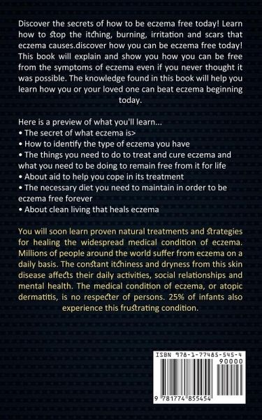 Discover the secrets of how to be eczema free today! Learn how to stop the itching, burning, irritation and scars that eczema causes.discover how you can be eczema free today! This book will explain and show you how you can be free from the symptoms of eczema even if you never thought it was possible. The knowledge found in this book will help you learn how you or your loved one can beat eczema beginning today. Here is a preview of what you'll learn... * > * How to identify the type of eczema you have * The things you need to do to treat and cure eczema and what you need to be doing to remain free from it for life * About aid to help you cope in its treatment * The necessary diet you need to maintain in order to be eczema free forever * About clean living that heals eczema You will soon learn proven natural treatments and strategies for healing the widespread medical condition of eczema. Millions of people around the world suffer from eczema on a daily basis. The constant itchiness and dryness from this skin disease affects their daily activities, social relationships and mental health. The medical condition of eczema, or atopic dermatitis, is no respecter of persons. 25% of infants also experience this frustrating condition.