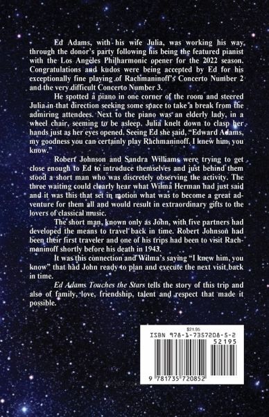 Ed Adams, with his wife Julia, was working his way through the donor's party following his being the featured pianist with the Los Angeles Philharmonic opener for the 2022 season. Congratulations and kudos were being accepted by Ed for his exceptionally fine playing of Rachmaninoff's Concerto Number 2 and the very difficult Concerto Number 3. He spotted a piano in one corner of the room and steered Julia in that direction seeking some space to take a break from the admiring attendees. Next to the piano was an elderly lady, in a wheelchair, seeming to be asleep. Julia knelt down to clasp her hands just as her eyes opened. Seeing Ed she said, "Edward Adams, my goodness you can certainly play Rachmaninoff. I knew him, you know." Robert Johnson and Sandra Williams were trying to get close enough to Ed to introduce themselves and just behind them stood a short man who was discretely observing this activity. The three waiting could clearly hear what Wilma Herman had just said and it was this that set-in motion what was to become a great adventure for all of them and would result in extraordinary gifts to the lovers of classical music. The short man, known only as John, with five partners had developed the means to travel back in time. Robert Johnson had been their first traveler and one of his trips had been to visit Rachmaninoff shortly before his death in 1943. It was this connection and Wilma saying, "I knew him, you know." that had John ready to plan and execute the next trip back in time. Ed Adams Touches The Stars tells the story of this trip and also of family, love, friendship, talent and respect that made it possible.¿