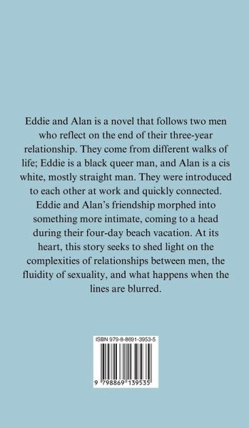 Eddie and Alan is a novel that follows two men who reflect on the end of their three-year relationship. They come from different walks of life; Eddie is a black queer man, and Alan is a cis white, mostly straight man. They were introduced to each other at work and quickly connected. Eddie and Alan's friendship morphed into something more intimate, coming to a head during their four-day beach vacation. At its heart, this story seeks to shed light on the complexities of relationships between men, the fluidity of sexuality, and what happens when the lines are blurred.