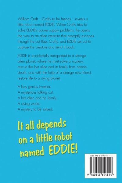 William Craft - Crafty to his friends - invents a little robot named EDDIE. When Crafty tries to solve EDDIE's power supply problems, he opens the way to an alien creature that promptly escapes through the cat flap. Crafty, and EDDIE set out to capture the creature and send it back. EDDIE is accidentally transported to a strange alien planet, where he must solve a mystery, rescue the lost alien and its family from certain death, and with the help of a strange new friend, restore life to a dying planet. A boy genius inventor. A mysterious talking cat. A lost alien and his family. A dying world. A mystery to be solved. It all depends on a little robot named EDDIE.