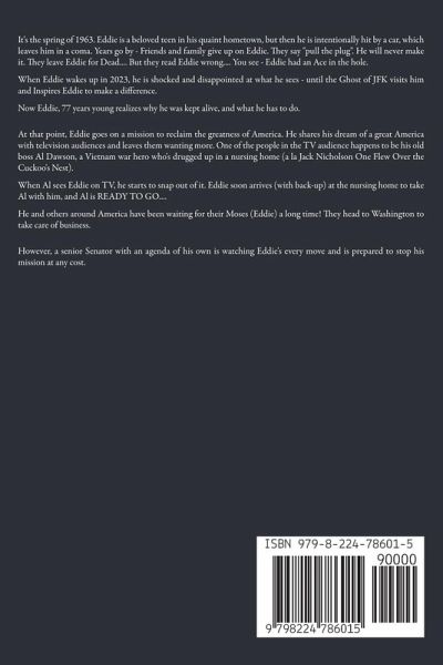 It's the spring of 1963. Eddie is a beloved teen in his quaint hometown, but then he is intentionally hit by a car, which leaves him in a coma. Years go by - Friends and family give up on Eddie. They say "pull the plug". He will never make it. They leave Eddie for Dead.... But they read Eddie wrong.... You see - Eddie had an Ace in the hole. When Eddie wakes up in 2023, he is shocked and disappointed at what he sees - until the Ghost of JFK visits him and Inspires Eddie to make a difference. Now Eddie, 77 years young realizes why he was kept alive, and what he has to do. At that point, Eddie goes on a mission to reclaim the greatness of America. He shares his dream of a great America with television audiences and leaves them wanting more. One of the people in the TV audience happens to be his old boss Al Dawson, a Vietnam war hero who's drugged up in a nursing home (a la Jack Nicholson One Flew Over the Cuckoo's Nest). When Al sees Eddie on TV, he starts to snap out of it. Eddie soon arrives (with back-up) at the nursing home to take Al with him, and Al is READY TO GO.... He and others around America have been waiting for their Moses (Eddie) a long time! They head to Washington to take care of business. However, a senior Senator with an agenda of his own is watching Eddie's every move and is prepared to stop his mission at any cost.