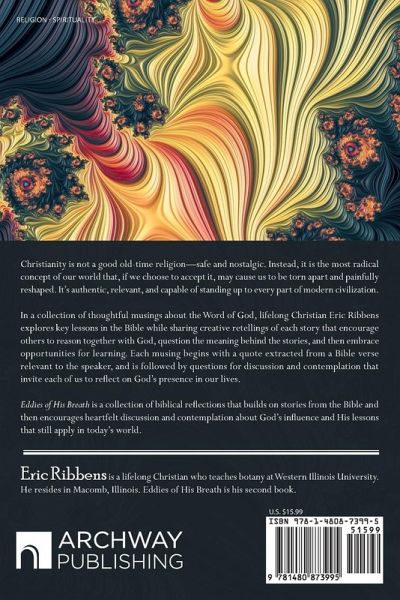 Christianity is not a good old-time religion--safe and nostalgic. Instead, it is the most radical concept of our world that, if we choose to accept it, may cause us to be torn apart and painfully reshaped. It's authentic, relevant, and capable of standing up to every part of modern civilization. In a collection of thoughtful musings about the Word of God, lifelong Christian Eric Ribbens explores key lessons in the Bible while sharing creative retellings of each story that encourage others to reason together with God, question the meaning behind the stories, and then embrace opportunities for learning. Each musing begins with a quote extracted from a Bible verse relevant to the speaker, and is followed by questions for discussion and contemplation that invite each of us to reflect on God's presence in our lives. Eddies of His Breath is a collection of biblical reflections that builds on stories from the Bible and then encourages heartfelt discussion and contemplation about God's influence and His lessons that still apply in today's world.