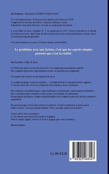 Un Détective privé et une Escorte Girl. Un couple passionnément explosif.Des enquêtes policières agrémentées d'une vie quotidienne trépidante.Un respect du lecteur et une légèreté de style.Le couple atypique trouvera sa place... en dépit de tout ce qui pourrait les opposer.C'est une série qui vivra au rythme de leurs amours, assez contrariés.Des enquêtes rocambolesques, entre loufoques et ubuesques, mais jamais tristouilles.Des scénettes tragi-comiques et des textes virevoltants et enflammés.Beaucoup de dialogues, remplis de philosophies de comptoir issues du café du commerce (équitable).Des personnages récurrents iront et viendront. Certains resteront, d'autres aussi.Eddy et Suze, c'est une grande famille ! On y accepte même les lecteurs !Venez suivre leurs aventures.C'est comme une série télévisuelle sur un papier.Pour le replay papier, ouvrez le livre à la page que vous souhaitez.