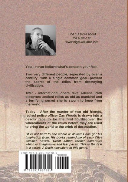 You'll never believe what's beneath your feet... Two very different people, seperated by over a century, with a single common goal...prevent the secret of the relics from destroying civilisation. 1897 - International opera diva Adelina Patti discovers ancient relics as old as mankind and a terrifying secret she is sworn to keep from the world. Today - After the murder of two old friends, retired police officer Zac Woods is drawn into a deadly race to be the first to discover the whereabouts of the relics before they are used to bring the world to the brink of destruction. "It's not hard to see where N Williams gets his inspiration from. His books remind me of early Clive Cussler novels. Great action thriller adventure which is imaginative and fast paced. This is the first in a series. A fresh new talent in this genre."