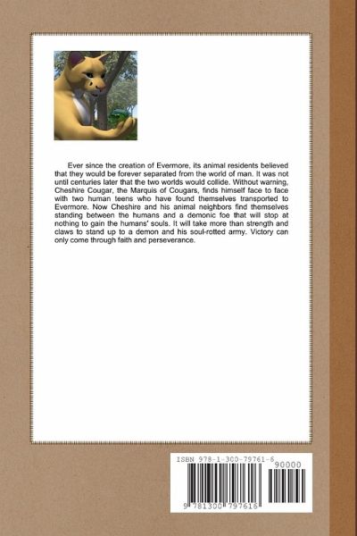 Ever since the creation of Evermore, its animal residents believed that they would be forever separated from the world of man. It was not until centuries later that the two worlds would collide. Without warning, Cheshire Cougar, the Marquis of Cougars, finds himself face to face with two human teens who have found themselves transported to Evermore. Now Cheshire and his animal neighbors find themselves standing between the humans and a demonic foe that will stop at nothing to gain the humans' souls. It will take more than strength and claws to stand up to a demon and his soul-rotted army. Victory can only come through faith and perseverance.
