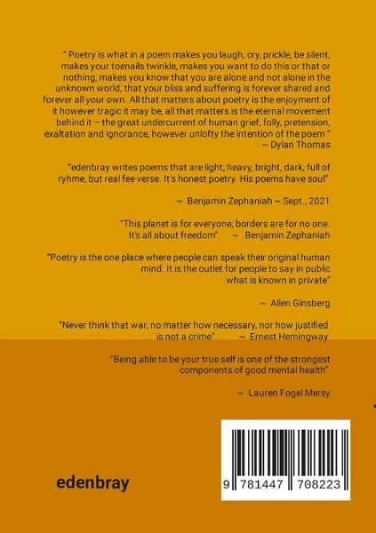 The journey of a poet recorded over nearly 60 years. If you remember Frank Zappa or lament what we may have lost but believe there is a brighter future you will love edenbray and what he has to say. Homespun philosophies moulded by history, a desire to face the challenge of humanities mistakes and a youthful willingness to adapt and change, while clinging steadfastly to the things that still mean something in this digital age. Self-taught, sometimes radical but always delightfully human - edenbray's edits might make you laugh or cry but it may also renew your vision and your hope for tomorrow.