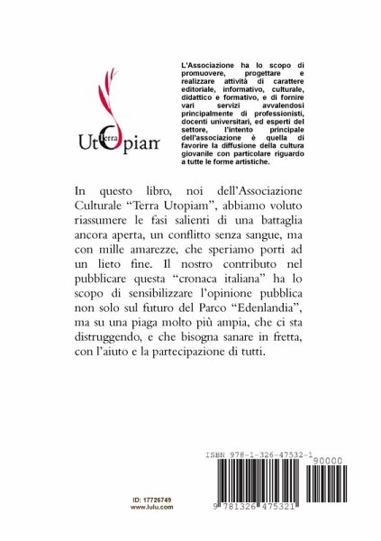In questo libro, noi dell'Associazione Culturale "Terra Utopiam", abbiamo voluto riassumere le fasi salienti di una battaglia ancora aperta, un conflitto senza sangue, ma con mille amarezze, che speriamo porti ad un lieto fine. Il nostro contributo nel pubblicare questa "cronaca italiana" ha lo scopo di sensibilizzare l'opinione pubblica non solo sul futuro del Parco "Edenlandia", ma su una piaga molto più ampia, che ci sta distruggendo, e che bisogna sanare in fretta, con l'aiuto e la partecipazione di tutti.