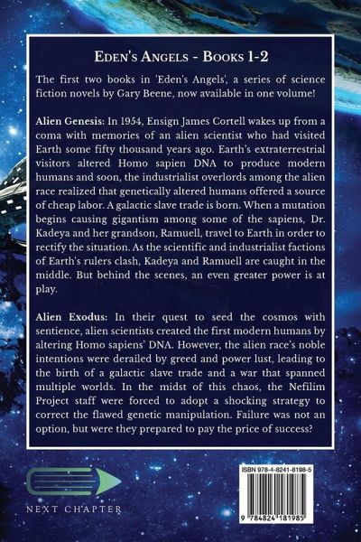 The first two books in 'Eden's Angels', a series of science fiction novels by Gary Beene, now available in one volume! Alien Genesis: In 1954, Ensign James Cortell wakes up from a coma with memories of an alien scientist who had visited Earth some fifty thousand years ago. Earth's extraterrestrial visitors altered Homo sapien DNA to produce modern humans and soon, the industrialist overlords among the alien race realized that genetically altered humans offered a source of cheap labor. A galactic slave trade is born. When a mutation begins causing gigantism among some of the sapiens, Dr. Kadeya and her grandson, Ramuell, travel to Earth in order to rectify the situation. As the scientific and industrialist factions of Earth's rulers clash, Kadeya and Ramuell are caught in the middle. But behind the scenes, an even greater power is at play. Alien Exodus: In their quest to seed the cosmos with sentience, alien scientists created the first modern humans by altering Homo sapiens' DNA. However, the alien race's noble intentions were derailed by greed and power lust, leading to the birth of a galactic slave trade and a war that spanned multiple worlds. In the midst of this chaos, the Nefilim Project staff were forced to adopt a shocking strategy to correct the flawed genetic manipulation. Failure was not an option, but were they prepared to pay the price of success?