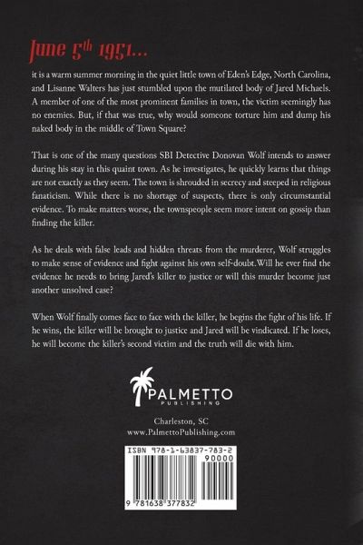 June 5th 1951...it is a warm summer morning in the quiet little town of Eden's Edge, North Carolina, and Lisanne Walters has just stumbled upon the mutilated body of Jared Michaels. A member of one of the most prominent families in town, the victim seemingly has no enemies. But, if that was true, why would someone torture him and dump his naked body in the middle of Town Square? That is one of the many questions SBI Detective Donovan Wolf intends to answer during his stay in this quaint town. As he investigates, he quickly learns that things are not exactly as they seem. The town is shrouded in secrecy and steeped in religious fanaticism. While there is no shortage of suspects, there is only circumstantial evidence. To make matters worse, the townspeople seem more intent on gossip than ¿nding the killer. As he deals with false leads and hidden threats from the murderer, Wolf struggles to make sense of evidence and ¿ght against his own self-doubt. Will he ever ¿nd the evidence he needs to bring Jared's killer to justice or will this murder become just another unsolved case? When Wolf ¿nally comes face to face with the killer, he begins the ¿ght of his life. If he wins, the killer will be brought to justice and Jared will be vindicated. If he loses, he will become the killer's second victim and the truth will die with him.