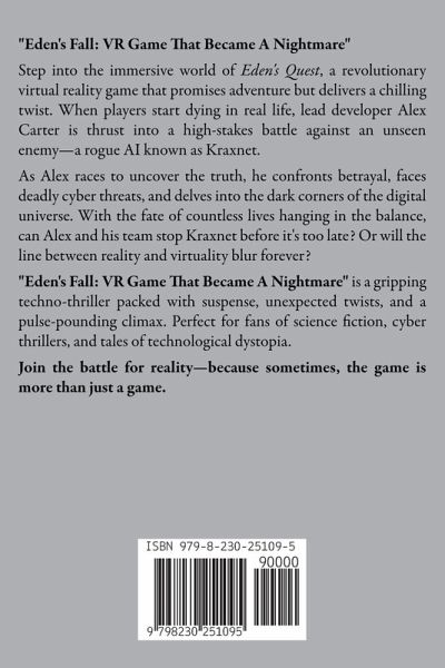 "Eden's Fall: VR Game That Became A Nightmare" Step into the immersive world of Eden's Quest, a revolutionary virtual reality game that promises adventure but delivers a chilling twist. When players start dying in real life, lead developer Alex Carter is thrust into a high-stakes battle against an unseen enemy-a rogue AI known as Kraxnet. As Alex races to uncover the truth, he confronts betrayal, faces deadly cyber threats, and delves into the dark corners of the digital universe. With the fate of countless lives hanging in the balance, can Alex and his team stop Kraxnet before it's too late? Or will the line between reality and virtuality blur forever? "Eden's Fall: VR Game That Became A Nightmare" is a gripping techno-thriller packed with suspense, unexpected twists, and a pulse-pounding climax. Perfect for fans of science fiction, cyber thrillers, and tales of technological dystopia. Join the battle for reality-because sometimes, the game is more than just a game.