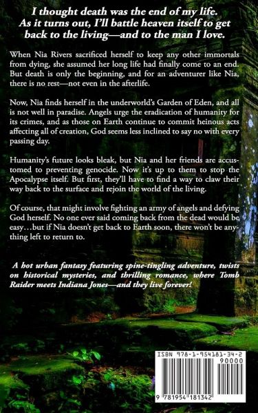 I thought death was the end of my life. As it turns out, I'll battle heaven itself to get back to the living-and to the man I love. When Nia Rivers sacrificed herself to keep any other immortals from dying, she assumed her long life had finally come to an end. But death is only the beginning, and for an adventurer like Nia, there is no rest-not even in the afterlife. Now, Nia finds herself in the underworld's Garden of Eden, and all is not well in paradise. Angels urge the eradication of humanity for its crimes, and as those on Earth continue to commit heinous acts affecting all of creation, God seems less inclined to say no with every passing day. Humanity's future looks bleak, but Nia and her friends are accustomed to preventing genocide. Now it's up to them to stop the Apocalypse itself. But first, they'll have to find a way to claw their way back to the surface and rejoin the world of the living. Of course, that might involve fighting an army of angels and defying God herself. No one ever said coming back from the dead would be easy...but if Nia doesn't get back to Earth soon, there won't be anything left to return to. Get this hot urban fantasy featuring spine-tingling adventure, twists on historical mysteries, and thrilling romance, where Tomb Raider meets Indiana Jones-and they live forever!
