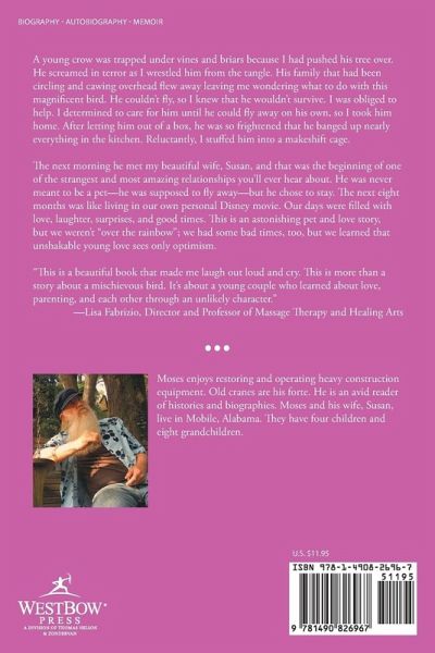 A young crow was trapped under vines and briars because I had pushed his tree over. He screamed in terror as I wrestled him from the tangle. His family that had been circling and cawing overhead flew away leaving me wondering what to do with this magnificent bird. He couldn't fly, so I knew that he wouldn't survive. I was obliged to help. I determined to care for him until he could fly away on his own, so I took him home. After letting him out of a box, he was so frightened that he banged up nearly everything in the kitchen. Reluctantly, I stuffed him into a makeshift cage. The next morning he met my beautiful wife, Susan, and that was the beginning of one of the strangest and most amazing relationships you'll ever hear about. He was never meant to be a pet-he was supposed to fly away-but he chose to stay. The next eight months was like living in our own personal Disney movie. Our days were filled with love, laughter, surprises, and good times. This is an astonishing pet and love story, but we weren't "over the rainbow"; we had some bad times, too, but we learned that unshakable young love sees only optimism. "This is a beautiful book that made me laugh out loud and cry. This is more than a story about a mischievous bird. It's about a young couple who learned about love, parenting, and each other through an unlikely character." -Lisa Fabrizio, Director and Professor of Massage Therapy and Healing Arts