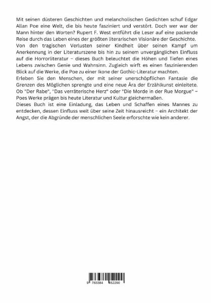 Mit seinen düsteren Geschichten und melancholischen Gedichten schuf Edgar Allan Poe eine Welt, die bis heute fasziniert und verstört. Doch wer war der Mann hinter den Worten? Rupert F. West entführt die Leser auf eine packende Reise durch das Leben eines der größten literarischen Visionäre der Geschichte. Von den tragischen Verlusten seiner Kindheit über seinen Kampf um Anerkennung in der Literaturszene bis hin zu seinem unvergänglichen Einfluss auf die Horrorliteratur - dieses Buch beleuchtet die Höhen und Tiefen eines Lebens zwischen Genie und Wahnsinn. Zugleich wirft es einen faszinierenden Blick auf die Werke, die Poe zu einer Ikone der Gothic-Literatur machten. Erleben Sie den Menschen, der mit seiner unerschöpflichen Fantasie die Grenzen des Möglichen sprengte und eine neue Ära der Erzählkunst einleitete. Ob "Der Rabe", "Das verräterische Herz" oder "Die Morde in der Rue Morgue" - Poes Werke prägen bis heute Literatur und Kultur gleichermaßen. Dieses Buch ist eine Einladung, das Leben und Schaffen eines Mannes zu entdecken, dessen Einfluss weit über seine Zeit hinausreicht - ein Architekt der Angst, der die Abgründe der menschlichen Seele erforschte wie kein anderer.