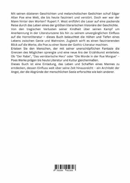Mit seinen düsteren Geschichten und melancholischen Gedichten schuf Edgar Allan Poe eine Welt, die bis heute fasziniert und verstört. Doch wer war der Mann hinter den Worten? Rupert F. West entführt die Leser auf eine packende Reise durch das Leben eines der größten literarischen Visionäre der Geschichte. Von den tragischen Verlusten seiner Kindheit über seinen Kampf um Anerkennung in der Literaturszene bis hin zu seinem unvergänglichen Einfluss auf die Horrorliteratur - dieses Buch beleuchtet die Höhen und Tiefen eines Lebens zwischen Genie und Wahnsinn. Zugleich wirft es einen faszinierenden Blick auf die Werke, die Poe zu einer Ikone der Gothic-Literatur machten. Erleben Sie den Menschen, der mit seiner unerschöpflichen Fantasie die Grenzen des Möglichen sprengte und eine neue Ära der Erzählkunst einleitete. Ob "Der Rabe", "Das verräterische Herz" oder "Die Morde in der Rue Morgue" - Poes Werke prägen bis heute Literatur und Kultur gleichermaßen. Dieses Buch ist eine Einladung, das Leben und Schaffen eines Mannes zu entdecken, dessen Einfluss weit über seine Zeit hinausreicht - ein Architekt der Angst, der die Abgründe der menschlichen Seele erforschte wie kein anderer.