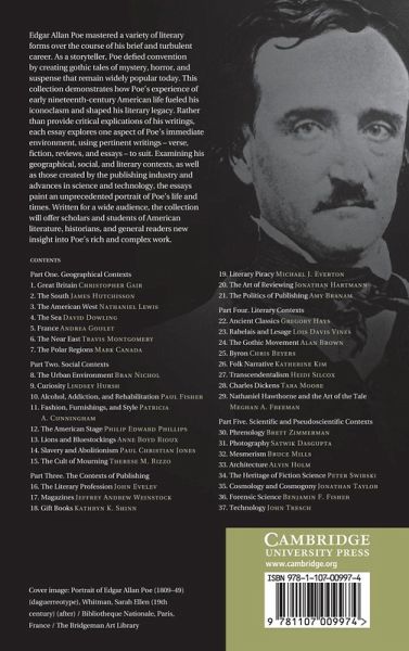 Edgar Allan Poe mastered a variety of literary forms over the course of his brief and turbulent career. As a storyteller, Poe defied convention by creating Gothic tales of mystery, horror and suspense that remain widely popular today. This collection demonstrates how Poe's experience of early nineteenth-century American life fueled his iconoclasm and shaped his literary legacy. Rather than provide critical explications of his writings, each essay explores one aspect of Poe's immediate environment, using pertinent writings - verse, fiction, reviews and essays - to suit. Examining his geographical, social and literary contexts, as well as those created by the publishing industry and advances in science and technology, the essays paint an unprecedented portrait of Poe's life and times. Written for a wide audience, the collection will offer scholars and students of American literature, historians and general readers new insight into Poe's rich and complex work.