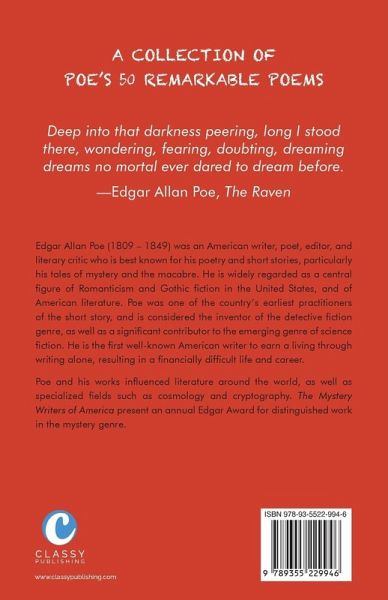 A COLLECTION OF POE'S 50 REMARKABLE POEMS Poems included in this collection: The Raven Annabel Lee Alone The Bells Eulalie-A Song Sonnet-Silence To One in Paradise Lenore Dreams To Helen The Haunted Palace A Dream Within a Dream The City in the Sea To F-- The Sleeper Ulalume Romance Sonnet-To Science Eldorado To M-- The Conqueror Worm Sonnet-To Zante To M. L. S.-- To the River -- A Dream Al Aaraaf To F--S S. O--D Bridal Ballad To My Mother To Helen The Valley of Unrest The Lake-To-- The Happiest Day, the Happiest Hour Catholic Hymn To -- -- Evening Star Stanzas Spirits of the Dead Israfel Song To -- Fairy-Land The Coliseum Dreamland For Annie Tamerlane Imitation A Pæan A Valentine An Enigma