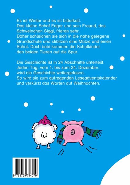 Es ist Winter und es ist bitterkalt. Das kleine Schaf Edgar und sein Freund, das Schweinchen Siggi, frieren sehr. Daher schleichen sie sich in die nahe gelegene Grundschule und stibitzen eine Mütze und einen Schal. Doch bald kommen die Schulkinder den beiden Tieren auf die Spur. Die Geschichte ist in 24 Abschnitte unterteilt. Jeden Tag, vom 1. bis zum 24. Dezember, wird die Geschichte weitergelesen. So wird sie zum aufregenden Leseadventskalender und verkürzt das Warten auf Weihnachten. Erstlesebuch ab der 2. Klasse oder Vorlesebuch ab 5 Jahren