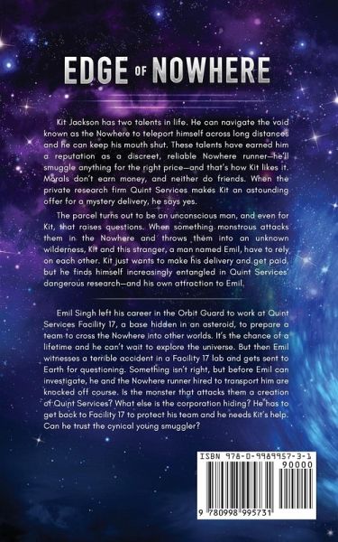 Kit Jackson has two talents in life. He can navigate the void known as the Nowhere to teleport himself across long distances and he can keep his mouth shut. These talents have earned him a reputation as a discreet, reliable Nowhere runner-he'll smuggle anything for the right price-and that's how Kit likes it. Morals don't earn money, and neither do friends. When the private research firm Quint Services makes Kit an astounding offer for a mystery delivery, he says yes. The parcel turns out to be an unconscious man, and even for Kit, that raises questions. When something monstrous attacks them in the Nowhere and throws them into an unknown wilderness, Kit and this stranger, a man named Emil, have to rely on each other. Kit just wants to make his delivery and get paid, but he finds himself increasingly entangled in Quint Services' dangerous research-and his own attraction to Emil. Emil Singh left his career in the Orbit Guard to work at Quint Services Facility 17, a base hidden in an asteroid, to prepare a team to cross the Nowhere into other worlds. It's the chance of a lifetime and he can't wait to explore the universe. But then Emil witnesses a terrible accident in a Facility 17 lab and gets sent to Earth for questioning. Something isn't right, but before Emil can investigate, he and the Nowhere runner hired to transport him are knocked off course. Is the monster that attacks them a creation of Quint Services? What else is the corporation hiding? He has to get back to Facility 17 to protect his team and he needs Kit's help. Can he trust the cynical young smuggler?