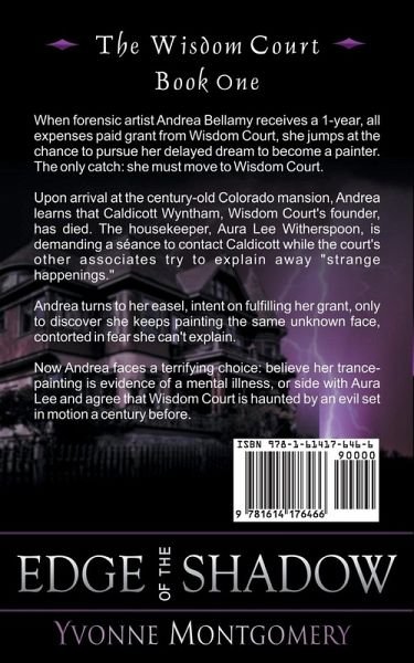 When forensic artist Andrea Bellamy receives a 1-year, all expenses paid grant from Wisdom Court, she jumps at the chance to pursue her delayed dream to become a painter. The only catch: she must move to Wisdom Court. Upon arrival at the century-old Colorado mansion, Andrea learns that Caldicott Wyntham, Wisdom Court's founder, has died. The housekeeper, Aura Lee Witherspoon, is demanding a séance to contact Caldicott while the court's other associates try to explain away "strange happenings." Andrea turns to her easel, intent on fulfilling her grant, only to discover she keeps painting the same unknown face, contorted in fear she can't explain. Now Andrea faces a terrifying choice: believe her trance-painting is evidence of a mental illness, or side with Aura Lee and agree that Wisdom Court is haunted by an evil set in motion a century before. THE WISDOM COURT SERIES, in order: Edge of the Shadow A Signal Shown All in Bad Time THE FINNY ALETTER MYSTERIES, in order: Scavenger Hunt Obstacle Course ABOUT YVONNE MONTGOMERY: Multi-published author Yvonne Montgomery lives in an old three-story Victorian house where the creaking stairs and quirky shadows provide real inspiration for her Wisdom Court novels.