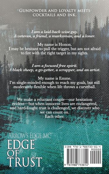 Gunpowder and loyalty meets cocktails and ink. I am a laid-back wise guy. A veteran, a friend, a marksman, and a loner. My name is Honon. I may be hesitant to pull the trigger, but am not afraid to fire with the right target in my sights. I am a focused free spirit. A black sheep, a go-getter, a scrapper, and an artist. My name is Emme. I'm single-minded enough to reach my goals, but still moderately flexible when life throws a curveball. We make a reluctant couple-our hesitation evident-but when innocent lives are endangered, and hard-fought trust is challenged, we discover who we can count on. Each other.