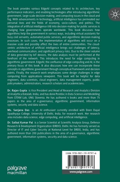The book provides various EdgeAI concepts related to its architecture, key performance indicators, and enabling technologies after introducing algorithmic government, large-scale decision-making, and computing issues in the cloud and fog. With advancements in technology, artificial intelligence has permeated our personal lives and the fields of economy, socio-culture, and politics. The integration of artificial intelligence (AI) into decision-making for public services is changing how governments operate worldwide. This book discusses how algorithms help the government in various ways, including virtual assistants for busy civil servants, automated public services, and algorithmic decision-making processes. In such cases, the implementation of algorithms will occur on a massive scale and possibly affect the lives of entire communities. The cloud-centric architecture of artificial intelligence brings out challenges of latency, overhead communication, and significant privacy risks. Due to the sheer volume of data generated by IoT devices, the data analysis must be performed at the forefront of the network. This introduces the need for edge computing in algorithmic government. EdgeAI, the confluence of edge computing and AI, is the primary focus of this book. It also discusses how one can incorporate these concepts in algorithmic government through conceptual framework and decision points. Finally, the research work emphasizes some design challenges in edge computing from applications viewpoint. This book will be helpful for data engineers, data scientists, cloud engineers, data management experts, public policymakers, administrators, research scholars and academicians.