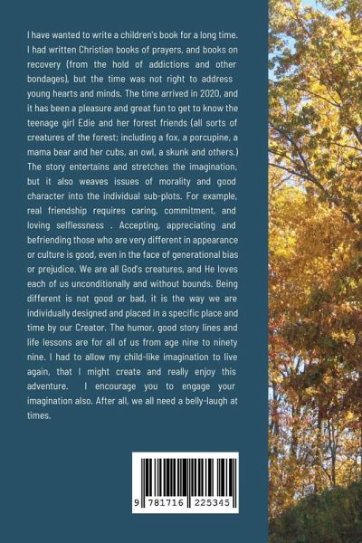 This is a book about teenage Edie and the forest friends she makes and communicates with. It is through our imaginations that we see and can relate to animals like Freddy the fox and Penelope the porcupine (and a host of other creatures of interest). It's about good humor, real friendships, and accepting and appreciating those who are different than us. It's about miracles, like the miracle of Edie speaking to forest creatures and their understanding each other; the miracle of rescuing a bear cub from a deep crevice in a huge rock; then the rescue that saved the life of another little cub from a hunter's old bear trap. It's about changing the ways of the forest; from mistrust, hostility and fear; to trust, friendship and acceptance. It's about a changing of hearts, and God's love for all.