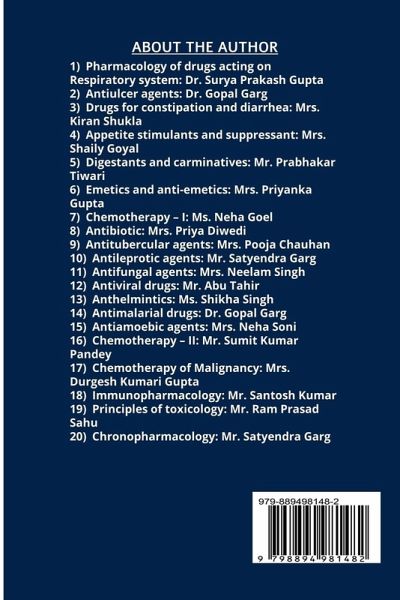 Explore the intricacies of pharmacology with this comprehensive guide covering a vast array of drugs and their therapeutic applications. Delve into the pharmacology of drugs acting on the respiratory system, providing relief from ailments like asthma and COPD. Understand the mechanisms and benefits of antiulcer agents, and discover the various medications for managing constipation and diarrhea. This book also covers appetite stimulants and suppressants, digestants, and carminatives, which aid in digestive health. Learn about emetics and anti-emetics, crucial for managing nausea and vomiting. A substantial portion of the book is dedicated to chemotherapy, detailing the pharmacology of antibiotics, antitubercular, antileprotic, antifungal, antiviral drugs, and more. Gain insights into anthelmintics, antimalarial, and antiamoebic agents. The book also delves into chemotherapy for malignancies and the burgeoning field of immunopharmacology. Additional chapters cover principles of toxicology and chronopharmacology, providing a thorough understanding of drug actions over time and their toxicological aspects. This book is an essential resource for students and professionals in the field of pharmacology.