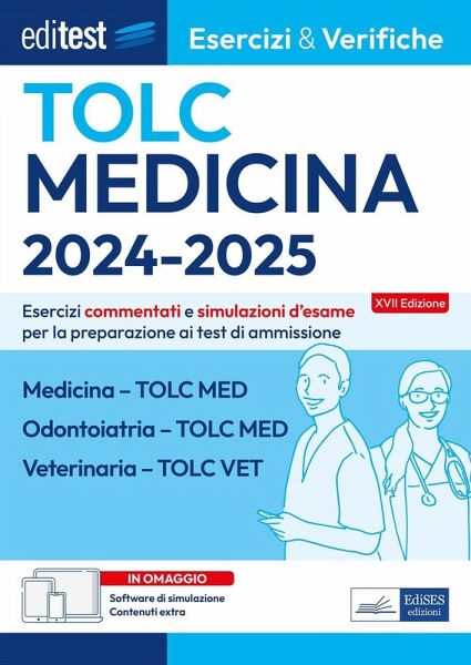 Raccolta di esercizi commentati e simulazioni d'esame per la preparazione ai test di ammissione a Medicina-Odontoiatria (TOLC-MED) e Veterinaria (TOLC-VET). Il testo è strutturato in due parti. La prima parte comprende centinaia di quesiti risolti e commentati suddivisi per materia. I quiz, tratti in parte dalle prove ufficiali degli ultimi anni, vertono su tutte le materie oggetto d'esame, favorendo il ripasso delle nozioni teoriche previste, così da individuare gli argomenti in cui si è più deboli e procedere a uno studio mirato della teoria. La seconda parte è dedicata alle simulazioni d'esame, simili per struttura e composizione al test reale, utili per esercitarsi nella soluzione di quiz analoghi a quelli ufficiali e per una verifica trasversale delle conoscenze. In omaggio il software di simulazione che replica la struttura dei TOLC. Das Urheberrecht an bibliographischen und produktbeschreibenden Daten und an den bereitgestellten Bildern liegt bei Informazioni Editoriali, I.E. S.r.l., oder beim Herausgeber oder demjenigen, der die Genehmigung erteilt hat. Alle Rechte vorbehalten.