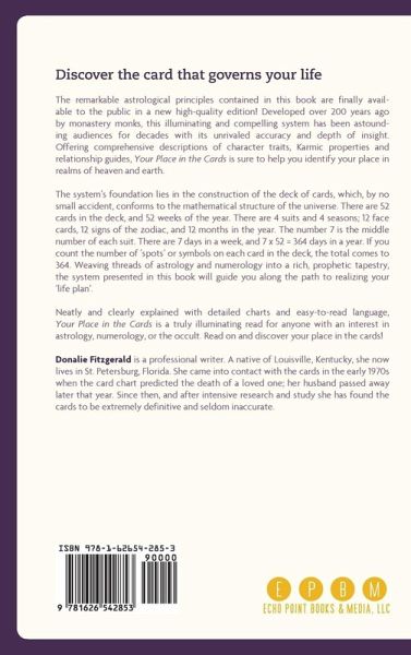 Each birthdate in the year has a corresponding card that is its governor and conditioner. One of these cards is YOURS! Developed over 200 years ago by monastery monks, this illuminating and compelling astrological system has been astounding audiences for decades with its unrivaled accuracy and depth of insight. Offering comprehensive descriptions of character traits, Karmic properties and relationship guides, Your Place in the Cards is sure to help you identify your place in realms of heaven and earth. The system's foundation lies in the construction of the deck of cards, which, by no small accident, conforms to the mathematical structure of the universe. There are 52 cards in the deck and 52 weeks in the year. There are 4 suits and 4 seasons; 12 face cards, 12 signs of the zodiac, and 12 months in the year. The number 7 is the middle number of each suit. There are 7 days in a week, and 7 x 52 = 364 days in a year. If you count the number of 'spots', or symbols, on each card in the deck, the total comes to 364. Weaving threads of astrology and numerology into a rich, prophetic tapestry, the system presented in this book will guide you along the path to realizing your 'life plan'. Neatly and clearly explained with detailed charts and easy-to-read language, Your Place in the Cards is a truly illuminating read for anyone with an interest in astrology, numerology, or the occult. Read on and discover your place in the cards!