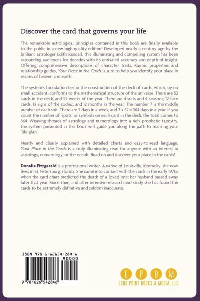 Each birthdate in the year has a corresponding card that is its governor and conditioner. One of these cards is YOURS! Developed over 200 years ago by monastery monks, this illuminating and compelling astrological system has been astounding audiences for decades with its unrivaled accuracy and depth of insight. Offering comprehensive descriptions of character traits, Karmic properties and relationship guides, Your Place in the Cards is sure to help you identify your place in realms of heaven and earth. The system's foundation lies in the construction of the deck of cards, which, by no small accident, conforms to the mathematical structure of the universe. There are 52 cards in the deck and 52 weeks in the year. There are 4 suits and 4 seasons; 12 face cards, 12 signs of the zodiac, and 12 months in the year. The number 7 is the middle number of each suit. There are 7 days in a week, and 7 x 52 = 364 days in a year. If you count the number of 'spots', or symbols, on each card in the deck, the total comes to 364. Weaving threads of astrology and numerology into a rich, prophetic tapestry, the system presented in this book will guide you along the path to realizing your 'life plan'. Neatly and clearly explained with detailed charts and easy-to-read language, Your Place in the Cards is a truly illuminating read for anyone with an interest in astrology, numerology, or the occult. Read on and discover your place in the cards!