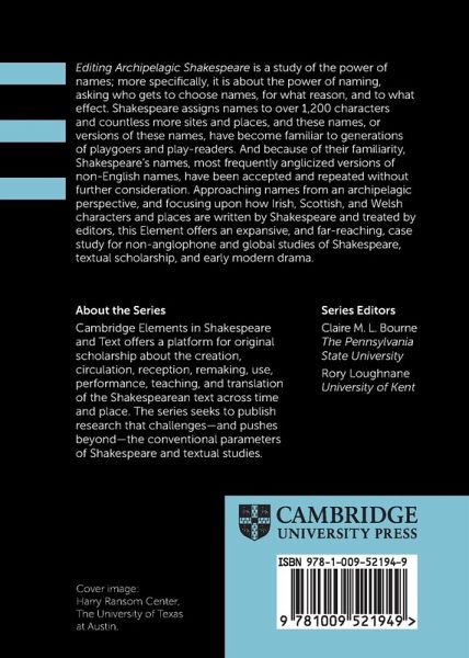 Editing Archipelagic Shakespeare explores the power of names in Shakespeare's works, focusing on Irish, Scottish, and Welsh characters and places. It explores who chooses names, why, and how they affect playgoers and readers. This Element offers a comprehensive case study for non-anglophone and global studies of Shakespeare and early modern drama.