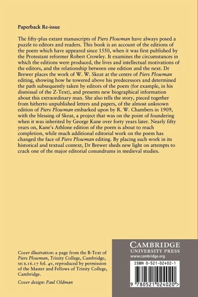 The fifty-plus extant manuscripts of Piers Plowman have always posed a puzzle to editors and readers. This book is an account of the editions of the poem which have appeared since 1550, when it was first published by the protestant reformer Robert Crowley. It examines the circumstances in which the editions were produced, the lives and intellectual motivations of the editors, and the relationship between one edition and the next. Brewer places the work of W. W. Skeat at the centre of Piers Plowman editing, showing how he towered above his predecessors and determined the path subsequently taken by editors of the poem, and presents much new biographical information about this extraordinary man. She uses a wide range of published and unpublished material to explain the difficulties of editing and to shed light on attempts to crack one of the major editorial conundrums in medieval studies.