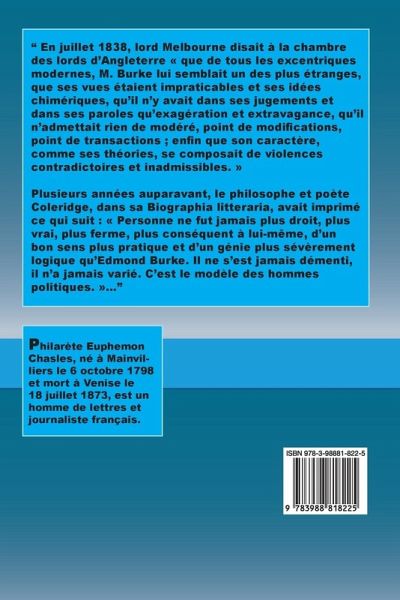 " En juillet 1838, lord Melbourne disait à la chambre des lords d'Angleterre que de tous les excentriques modernes, M. Burke lui semblait un des plus étranges, que ses vues étaient impraticables et ses idées chimériques, qu'il n'y avait dans ses jugements et dans ses paroles qu'exagération et extravagance, qu'il n'admettait rien de modéré, point de modifications, point de transactions ; enfin que son caractère, comme ses théories, se composait de violences contradictoires et inadmissibles. Plusieurs années auparavant, le philosophe et poète Coleridge, dans sa Biographia litteraria, avait imprimé ce qui suit : Personne ne fut jamais plus droit, plus vrai, plus ferme, plus conséquent à lui-même, d'un bon sens plus pratique et d'un génie plus sévèrement logique qu'Edmond Burke. Il ne s'est jamais démenti, il n'a jamais varié. C'est le modèle des hommes politiques. ..."