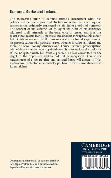 This pioneering study of Burke's engagement with Irish politics and culture argues that Burke's influential early writings on aesthetics are intimately connected to his lifelong political concerns. The concept of the sublime, which lay at the heart of his aesthetics, addressed itself primarily to the experience of terror, and it is this spectre that haunts Burke's political imagination throughout his career. Luke Gibbons argues that this found expression in his preoccupation with political terror, whether in colonial Ireland and India, or revolutionary America and France. Burke's preoccupation with violence, sympathy and pain allowed him to explore the dark side of the Enlightenment, but from a position no less committed to the plight of the oppressed, and to political emancipation. This major reassessment of a key political and cultural figure will appeal to Irish studies and Post-Colonial specialists, political theorists and Romanticists.