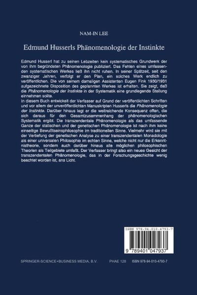In this book, Nam-In Lee reconstructs the Phänomenologie der Instinkte on the basis of the already published works and, above all, of the unpublished manuscripts of Husserl. Moreover, he draws out the consequences which the Phänomenologie der Instinkte bears for the whole system of phenomenology. Transcendental phenomenology, in its form of a genetic phenomenology of which the Phänomenologie der Instinkte is the concluding part, can, according to him, no longer be considered as one-sided philosophy of consciousness in the traditional sense, as it has often been thought of hitherto. Thus, the author presents a new face of phenomenology; one which has scarcely been noticed in the field of Husserl studies until now.