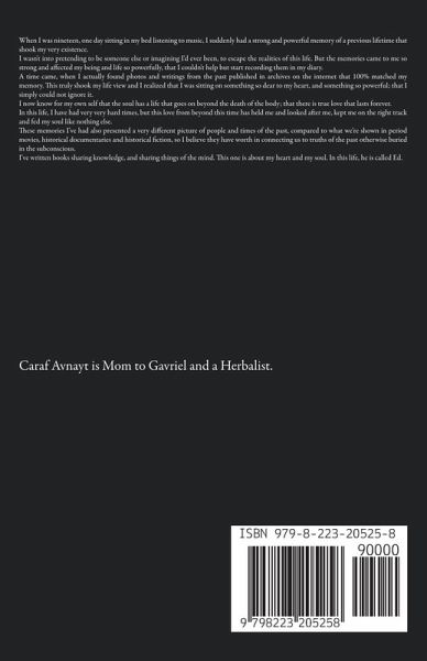 When I was nineteen, one day sitting in my bed listening to music, I suddenly had a strong and powerful memory of a previous lifetime that shook my very existence. I wasn't into pretending to be someone else or imagining I'd ever been, to escape the realities of this life. But the memories came to me so strong and affected my being and life so powerfully, that I couldn't help but start recording them in my diary. A time came, when I actually found photos and writings from the past published in archives on the internet that 100% matched my memory. This truly shook my life view and I realized that I was sitting on something so dear to my heart, and something so powerful; that I simply could not ignore it. I now know for my own self that the soul has a life that goes on beyond the death of the body; that there is true love that lasts forever. In this life, I have had very very hard times, but this love from beyond this time has held me and looked after me, kept me on the right track and fed my soul like nothing else. These memories I've had also presented a very different picture of people and times of the past, compared to what we're shown in period movies, historical documentaries and historical fiction, so I believe they have worth in connecting us to truths of the past otherwise buried in the subconscious. I've written books sharing knowledge, and sharing things of the mind. This one is about my heart and my soul. In this life, he is called Ed.