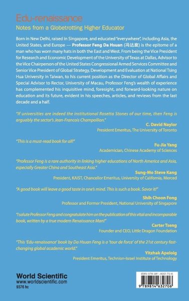 Born in New Delhi, raised in Singapore, and educated "everywhere", including Asia, the United States, and Europe — Professor Feng Da Hsuan (¿¿¿) is the epitome of a man who has worn many hats in both the East and West. From being the Vice President for Research and Economic Development of the University of Texas at Dallas, Advisor to the Vice Chairperson of the United States Congressional Armed Services Committee and Senior Vice President of Global Strategy, Development and Evaluation at National Tsing Hua University in Taiwan, to his current position as the Director of Global Affairs and Special Advisor to Rector, University of Macau, Professor Feng's wealth of experience has complemented his inquisitive mind, foresight, and forward-looking nature on education and its future, evident in his speeches, articles, and reviews from the last decade and a half. Edu-renaissance: Notes from a Globetrotting Higher Educator brings together 50 of these pieces and they cover a wide range of ever-relevant topics such as the value of higher education in society, the role Asian universities have in the world, and hot topics like university ranking. Professor Feng also shares his new ideas and insight on promising young universities and higher education in the 21st century. One example is his emphasis on how the promotion of liberal arts and interdisciplinary approaches are the way forward for higher education institutions in the 21st century. By relating these topics to countries such as Taiwan, Korea, India, China, the United States, Israel, and Russia, this volume is ideal for readers who are part of a global community concerned about one of the most important issues in the world today — education.