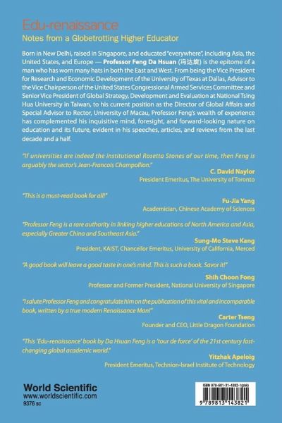 Born in New Delhi, raised in Singapore, and educated "everywhere", including Asia, the United States, and Europe — Professor Feng Da Hsuan (¿¿¿) is the epitome of a man who has worn many hats in both the East and West. From being the Vice President for Research and Economic Development of the University of Texas at Dallas, Advisor to the Vice Chairperson of the United States Congressional Armed Services Committee and Senior Vice President of Global Strategy, Development and Evaluation at National Tsing Hua University in Taiwan, to his current position as the Director of Global Affairs and Special Advisor to Rector, University of Macau, Professor Feng's wealth of experience has complemented his inquisitive mind, foresight, and forward-looking nature on education and its future, evident in his speeches, articles, and reviews from the last decade and a half. Edu-renaissance: Notes from a Globetrotting Higher Educator brings together 50 of these pieces and they cover a wide range of ever-relevant topics such as the value of higher education in society, the role Asian universities have in the world, and hot topics like university ranking. Professor Feng also shares his new ideas and insight on promising young universities and higher education in the 21st century. One example is his emphasis on how the promotion of liberal arts and interdisciplinary approaches are the way forward for higher education institutions in the 21st century. By relating these topics to countries such as Taiwan, Korea, India, China, the United States, Israel, and Russia, this volume is ideal for readers who are part of a global community concerned about one of the most important issues in the world today — education.