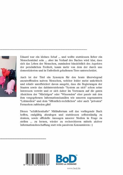 Eduard war ein kleines Schaf ... und wollte stattdessen lieber ein Menschenkind sein ... aber im Verlauf des Buches wird klar, dass sich das Leben der Menschen, zumindest hinsichtlich des Aspektes der persönlichen Freiheit, kaum mehr von dem der durch uns domestizierten und in Unfreiheit gehaltenen Tiere unterscheidet. Auch ist der Titel ein Synonym für den heute überwiegend anzutreffenden naiven Menschen, welcher leider meist unkritisch und relativ unreflektiert davon ausgeht, dass die Regierungen der Staaten sowie das dahinterstehende "System an sich" schon seine Interessen vertritt und er sich daher im Vertrauen auf die guten Absichten der "Mächtigen" oder "Wissenden" eher passiv mit den ihm vorgegebenen Informationskanälen wie unseren sogenannten "Leitmedien" und dem "öffentlich-rechtlichen" oder auch "privaten" Fernsehen zufrieden gibt! Dieses "schäfchenhafte" Mitläufertum soll das vorliegende Buch helfen, endgültig abzulegen und stattdessen selbstständig zu denken, sowie offizielle Aussagen unserer Medien in Frage zu stellen ... zu lernen, wieder zu recherchieren mittels aktiver Informationsbeschaffung statt rein passivem Konsumieren :-)