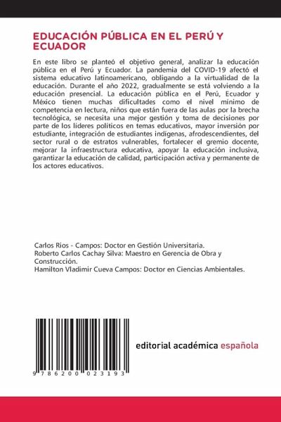 En este libro se planteó el objetivo general, analizar la educación pública en el Perú y Ecuador. La pandemia del COVID-19 afectó el sistema educativo latinoamericano, obligando a la virtualidad de la educación. Durante el año 2022, gradualmente se está volviendo a la educación presencial. La educación pública en el Perú, Ecuador y México tienen muchas dificultades como el nivel mínimo de competencia en lectura, niños que están fuera de las aulas por la brecha tecnológica, se necesita una mejor gestión y toma de decisiones por parte de los líderes políticos en temas educativos, mayor inversión por estudiante, integración de estudiantes indígenas, afrodescendientes, del sector rural o de estratos vulnerables, fortalecer el gremio docente, mejorar la infraestructura educativa, apoyar la educación inclusiva, garantizar la educación de calidad, participación activa y permanente de los actores educativos.