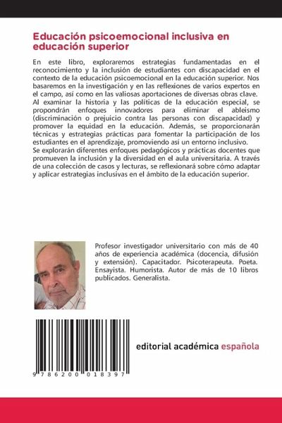 En este libro, exploraremos estrategias fundamentadas en el reconocimiento y la inclusión de estudiantes con discapacidad en el contexto de la educación psicoemocional en la educación superior. Nos basaremos en la investigación y en las reflexiones de varios expertos en el campo, así como en las valiosas aportaciones de diversas obras clave.Al examinar la historia y las políticas de la educación especial, se propondrán enfoques innovadores para eliminar el ableismo (discriminación o prejuicio contra las personas con discapacidad) y promover la equidad en la educación. Además, se proporcionarán técnicas y estrategias prácticas para fomentar la participación de los estudiantes en el aprendizaje, promoviendo así un entorno inclusivo.Se explorarán diferentes enfoques pedagógicos y prácticas docentes que promueven la inclusión y la diversidad en el aula universitaria. A través de una colección de casos y lecturas, se reflexionará sobre cómo adaptar y aplicar estrategias inclusivas en el ámbito de la educación superior.