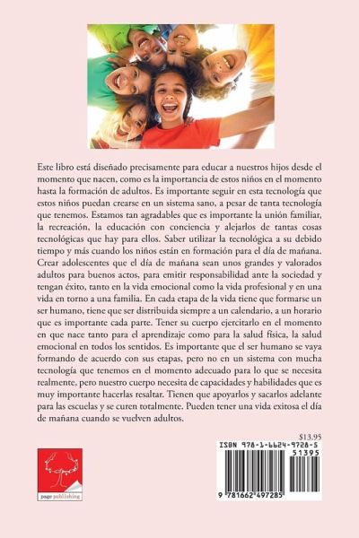 Este libro esta disenado precisamente para educar a nuestros hijos desde el momento que nacen, como es la importancia de estos ninos en el momento hasta la formacion de adultos. Es importante seguir en esta tecnologia que estos ninos puedan crearse en un sistema sano, a pesar de tanta tecnologia que tenemos. Estamos tan agradables que es importante la union familiar, la recreacion, la educacion con conciencia y alejarlos de tantas cosas tecnologicas que hay para ellos. Saber utilizar la tecnologica a su debido tiempo y mas cuando los ninos estan en formacion para el dia de manana. Crear adolescentes que el dia de manana sean unos grandes y valorados adultos para buenos actos, para emitir responsabilidad ante la sociedad y tengan exito, tanto en la vida emocional como la vida profesional y en una vida en torno a una familia. En cada etapa de la vida tiene que formarse un ser humano, tiene que ser distribuida siempre a un calendario, a un horario que es importante cada parte. Tener su cuerpo ejercitarlo en el momento en que nace tanto para el aprendizaje como para la salud fisica, la salud emocional en todos los sentidos. Es importante que el ser humano se vaya formando de acuerdo con sus etapas, pero no en un sistema con mucha tecnologia que tenemos en el momento adecuado para lo que se necesita realmente, pero nuestro cuerpo necesita de capacidades y habilidades que es muy importante hacerlas resaltar. Tienen que apoyarlos y sacarlos adelante para las escuelas y se curen totalmente. Pueden tener una vida exitosa el dia de manana cuando se vuelven adultos.