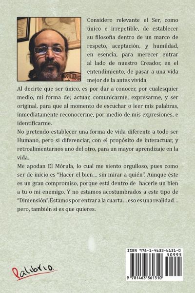 Considero relevante el Ser, como único e irrepetible, de establecer su filosofía dentro de un marco de respeto, aceptación, y humildad, en esencia, para merecer entrar al lado de nuestro Creador, en el entendimiento, de pasar a una vida mejor de la antes vivida. Al decirte que ser único, es por dar a conocer, por cualesquier medio, mi forma de; actuar, comunicarme, expresarme, y ser original, para que al momento de escuchar o leer mis palabras, inmediatamente reconocerme, por medio de mis expresiones, e identificarme. No pretendo establecer una forma de vida diferente a todo ser Humano, pero si diferenciar, con el propósito de interactuar, y retroalimentarnos uno del otro, para un mayor aprendizaje en la vida. Me apodan El Mórula, lo cual me siento orgulloso, pues como ser de inicio es "Hacer el bien... sin mirar a quién". Aunque éste es un gran compromiso, porque está dentro de hacerle un bien a tu o mi enemigo. Y no estamos acostumbrados a este tipo de "Dimensión". Estamos por entrar a la cuarta... eso es una realidad... pero, también si es que quieres.